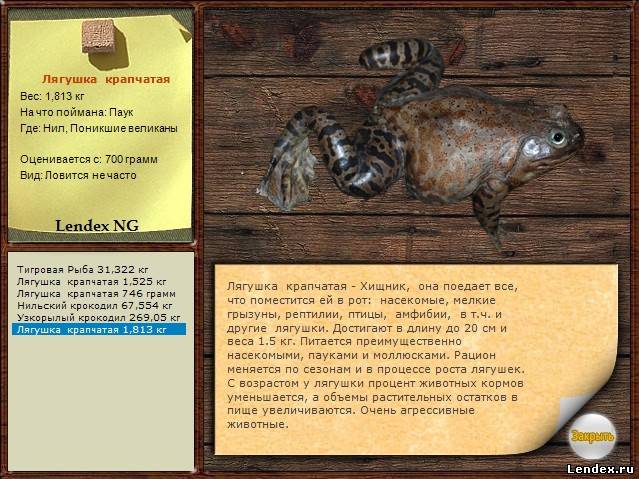 Лягушка крапчатая 1,813 кг. Поймана на Нил: Поникшие великаны, Паук, Глубина 0