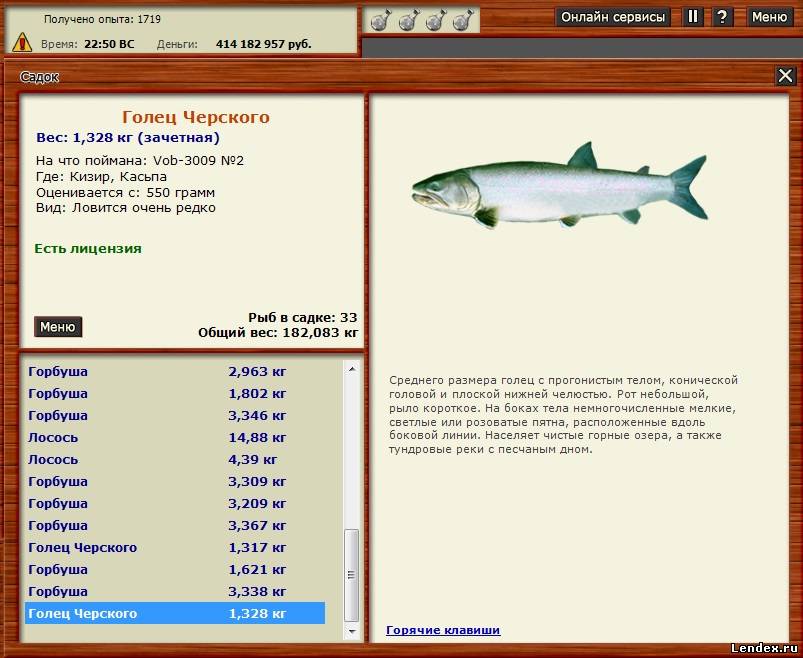 Где пойман: Кизир, Касьпа Способ ловли: спиннинг, проводка медленная с глубины 400 Насадка: Vob-3009 №2 Активность: вечер, 19-20 Прикормка: нет Очки опыта: 1 697 Оценен на: 4 446 руб.