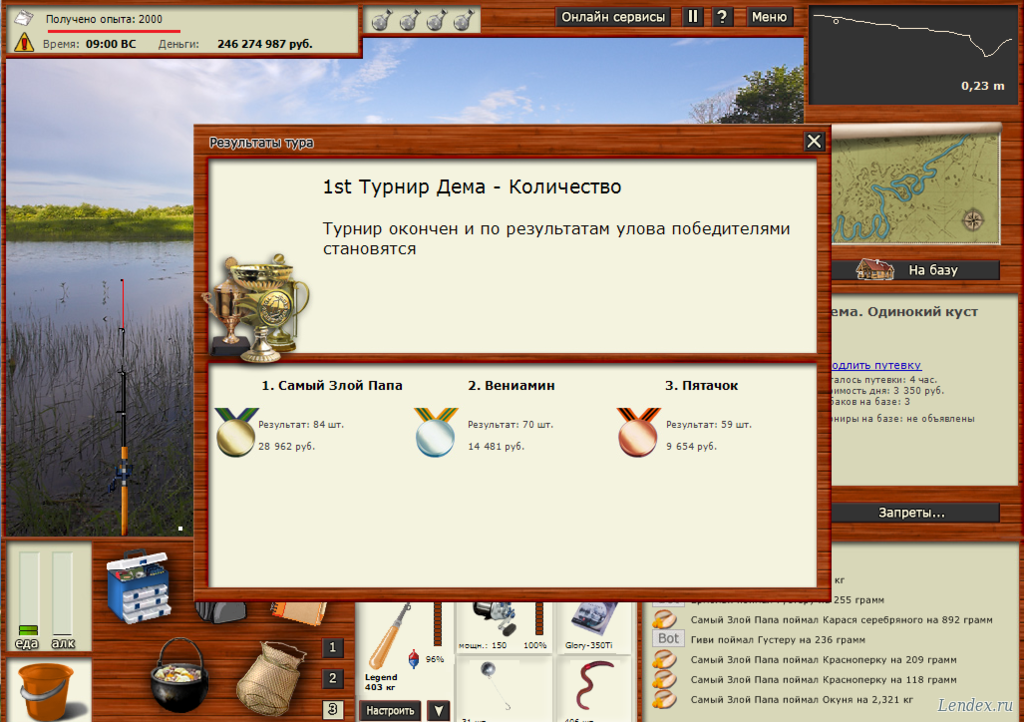Турнир: МК Закрытый Время: 05:00-21:00 (день) Локация: рачий омут Снасть: донка Наживка: червь Прикормка: - Результат: 153 шт.; 1 место Опыт: 34150 (спиннинг+коньяк) Разряд: 416